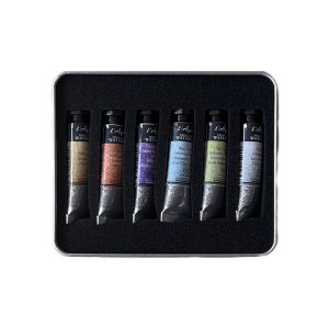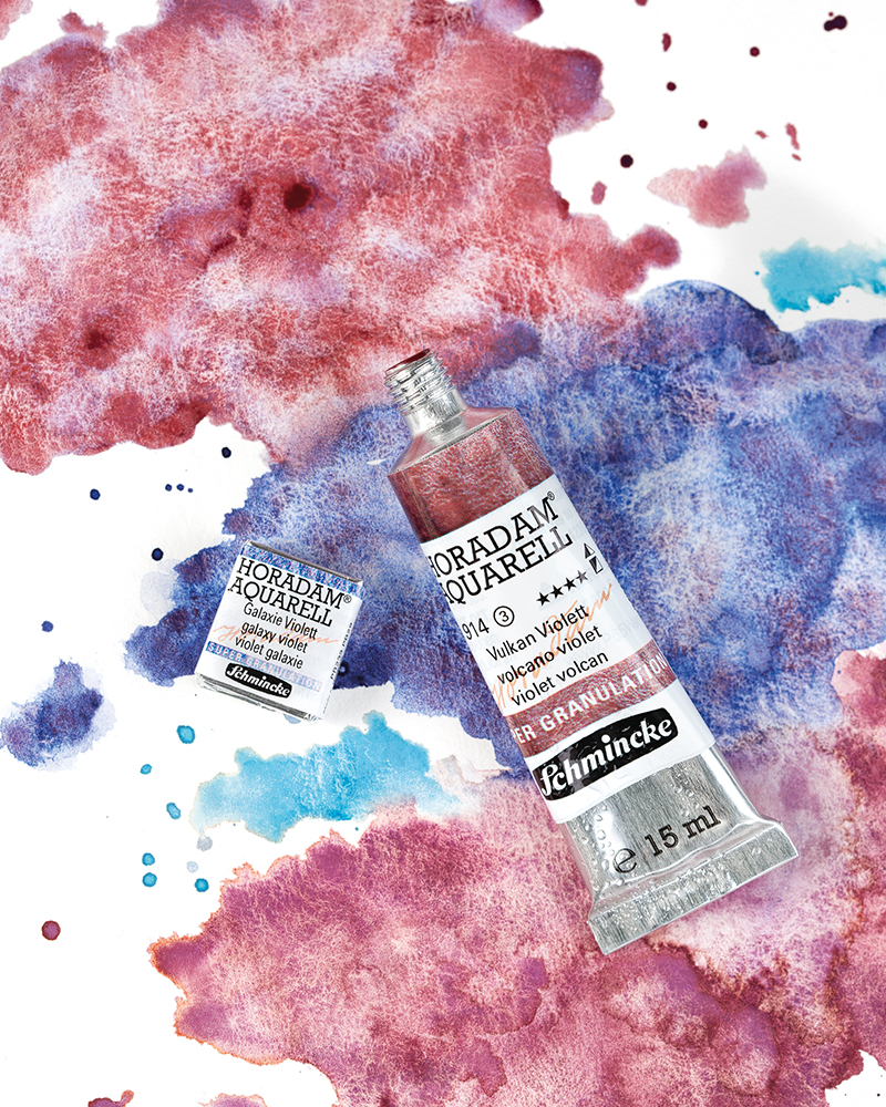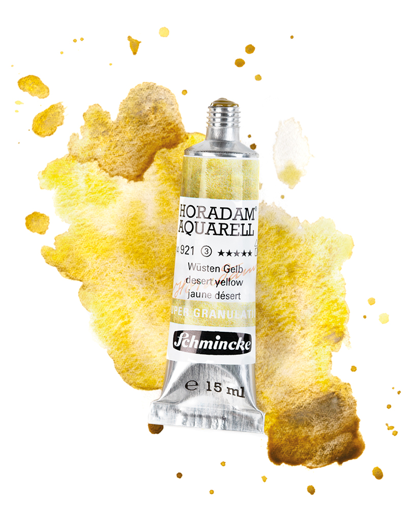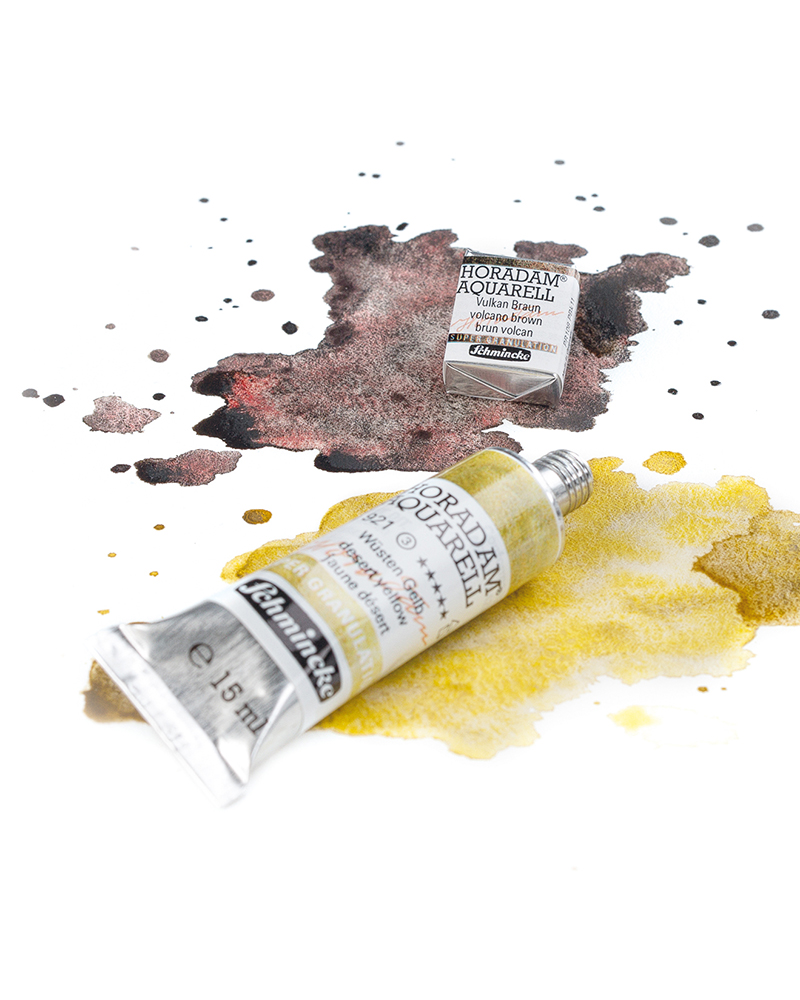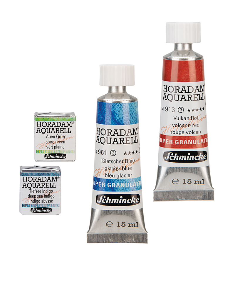 La nuova edizione speciale degli acquerelli Horadam di Schmincke “Colori super granulati” contiene numerose tonalità  in tubetti da 15 ml e da 1/2 godet, divisi in diverse serie. Combinando almeno 2 pigmenti Horadam granulanti, questo effetto si intensifica fino alla “super granulazione”. Le tonalità di colore sono formulate con pigmenti di diverse gamme di colore, in modo che l’effetto di granulazione dia luogo a ulteriori variazioni di colore. Ad esempio, la tonalità ” Indaco Deep sea” è una combinazione di pigmento viola e verde, mentre “Bruno Glacier” contiene un pigmento bruno e un pigmento verde. Questa nuova formulazione naturale dei colori varia a seconda del supporto e della quantità d’acqua utilizzata. Più ruvida è la carta, più forte è l’effetto di granulazione.