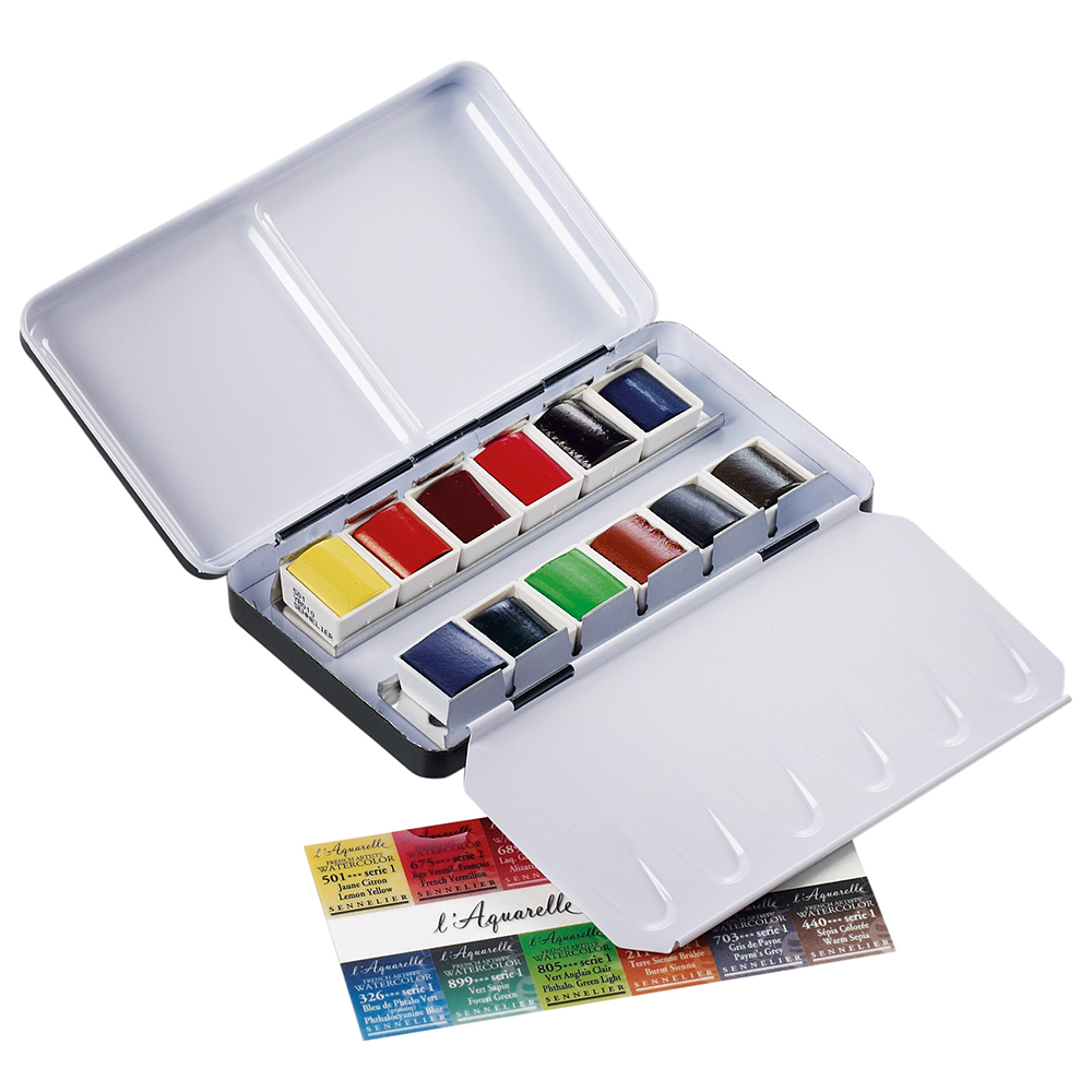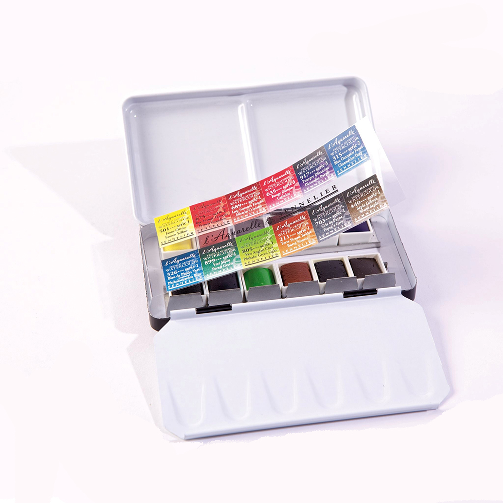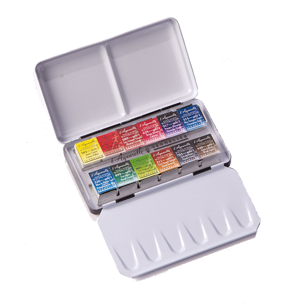 Questa particolare Confezione Sennelier, è un Acquerello di alta qualità, extra fine, a base di miele, incomparabile nella brillantezza e duratura nel tempo. 12 mezzi Godet contenuti in una scarola di metallo, dalle piccole dimensioni: 12 x 7 cm circa.