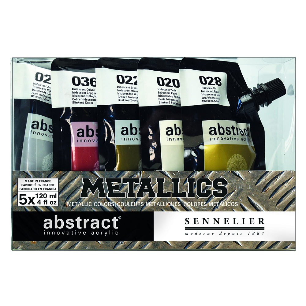 Una selezione di 5 colori cangianti metallizzati della gamma Sennelier Abstract di acrilici per artisti.