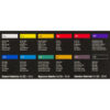 - Bianco di titanio, Oltremare, Giallo primario, Cyan primario, Giallo azo medio, Verde permanente scuro, Vermiglione, Ocra gialla, Rosso pirrolo, Terra d’ombra bruciata, Blu permanente violetto, Nero ossido.
