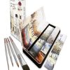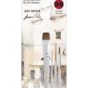 I 4 pennelli contenuti all’interno sono tutti in filati sintetici diversi, con con ghiera in ottone nichelato e manico dalla forma classica in betulla verniciato all’acqua di colore grigio chiaro, il decoro arancione richiama un tratto distintivo dell’artista: che è solito intingere le code dei pennelli nella vernice per evitare di perderli durante le sessioni campestri di pittura en plein air.