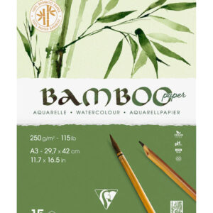 Il Nuovo blocco di Bambù Clairefontaine ha una carta per acquerello unica fatta di bambù naturale al 100%, che lo rende più ecologico dei tradizionali blocchi per acquerello. Le carte naturalmente bianche hanno una tonalità delicata e calda caratteristica del bambù e un’interessante trama, che conferisce loro un carattere unico e rende ogni opera creata su di esse uno stile unico. Carta ottenuta con un processo produttivo privo di acidi, ha un pH neutro ed è 100% vegana. La grammatura di 250 g/m² lo rende sufficientemente spesso da non far passare la vernice ai fogli successivi, anche durante l’applicazione di successivi strati di vernice. Oltre ai colori ad acquerello, è consigliato anche per schizzi, disegni con carboncino, matita, sanguigna, pastelli e tecniche miste.