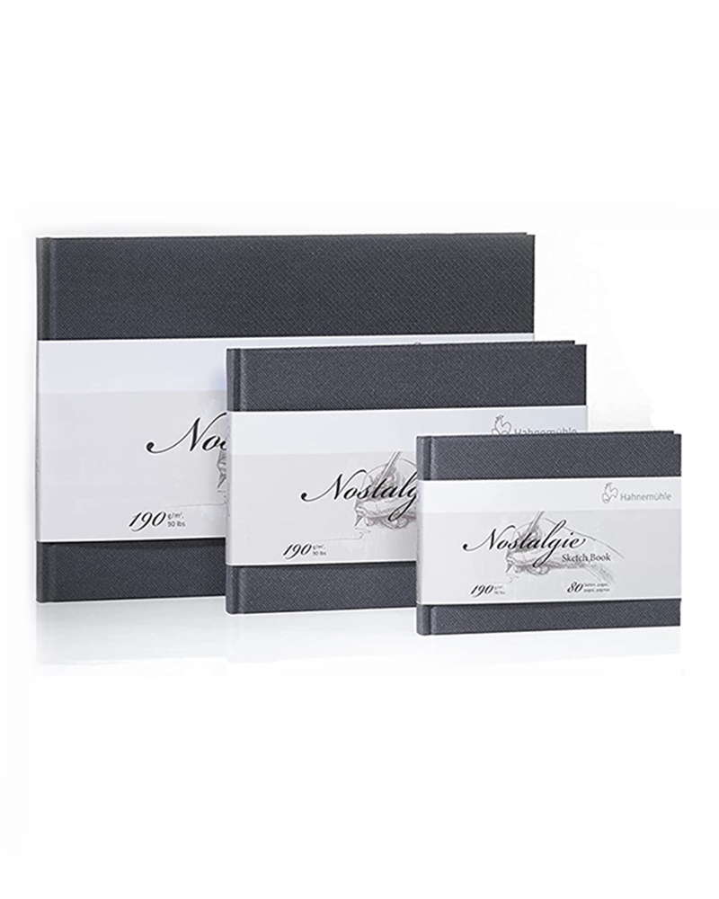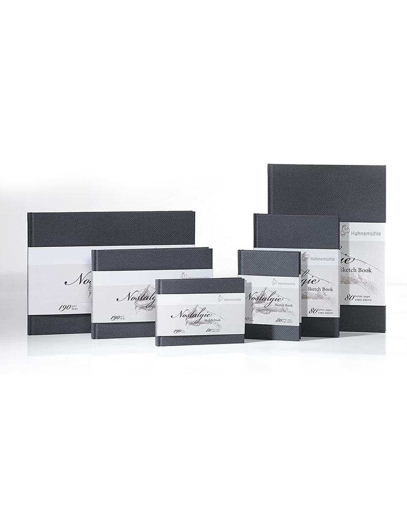 Il blocco per schizzi Nostalgie Landscape di HAHNEMÜHLE contiene 40 fogli (80 pagine) di carta da disegno color bianca naturale dalla grammatura di 190 g/m² con una presa confortevole.