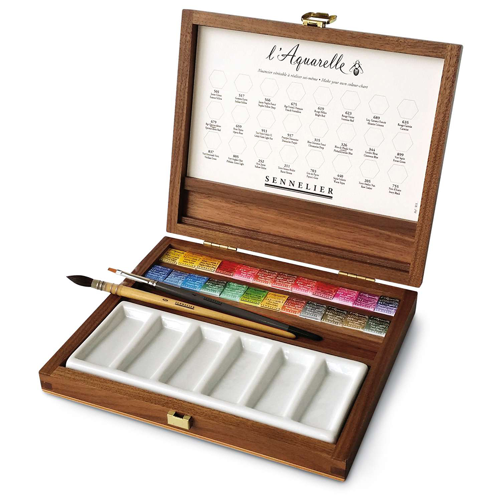 Un bellissimo set di acquerelli di alta qualità presentati in una scatola di noci oliate.
