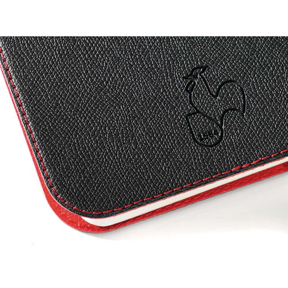 La copertina è classicamente unica, robusta e allo stesso tempo protegge perfettamente il contenuto del tuo DiaryFlex. È rigido, rivestito in pelle sintetica testurizzata, in nero all’esterno e dettagli in cuciture rosse, e rosso all’interno.