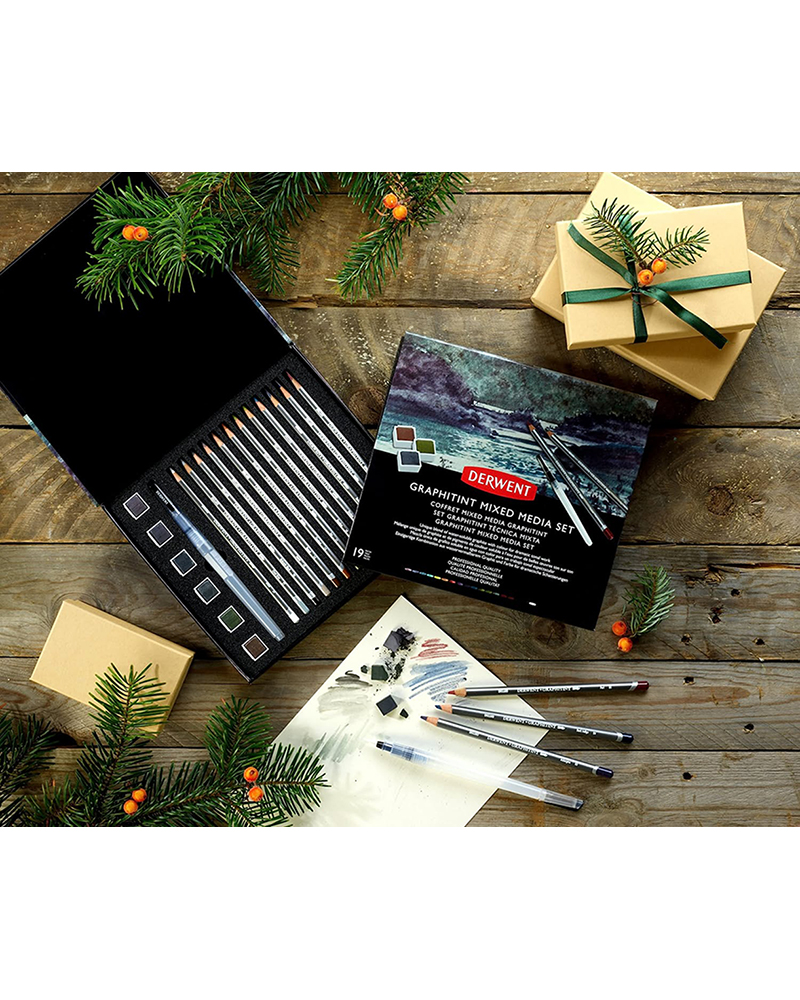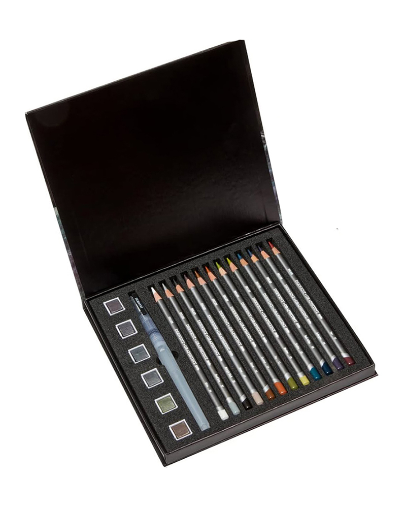Il Derwent Graphitint Mixed Media Set include una gamma curata di sei tonalità di pittura e dodici matite che offrono una tavolozza di colori tenui e naturalmente tenui, ideali per paesaggi urbani e naturali o per l’arte espressiva.