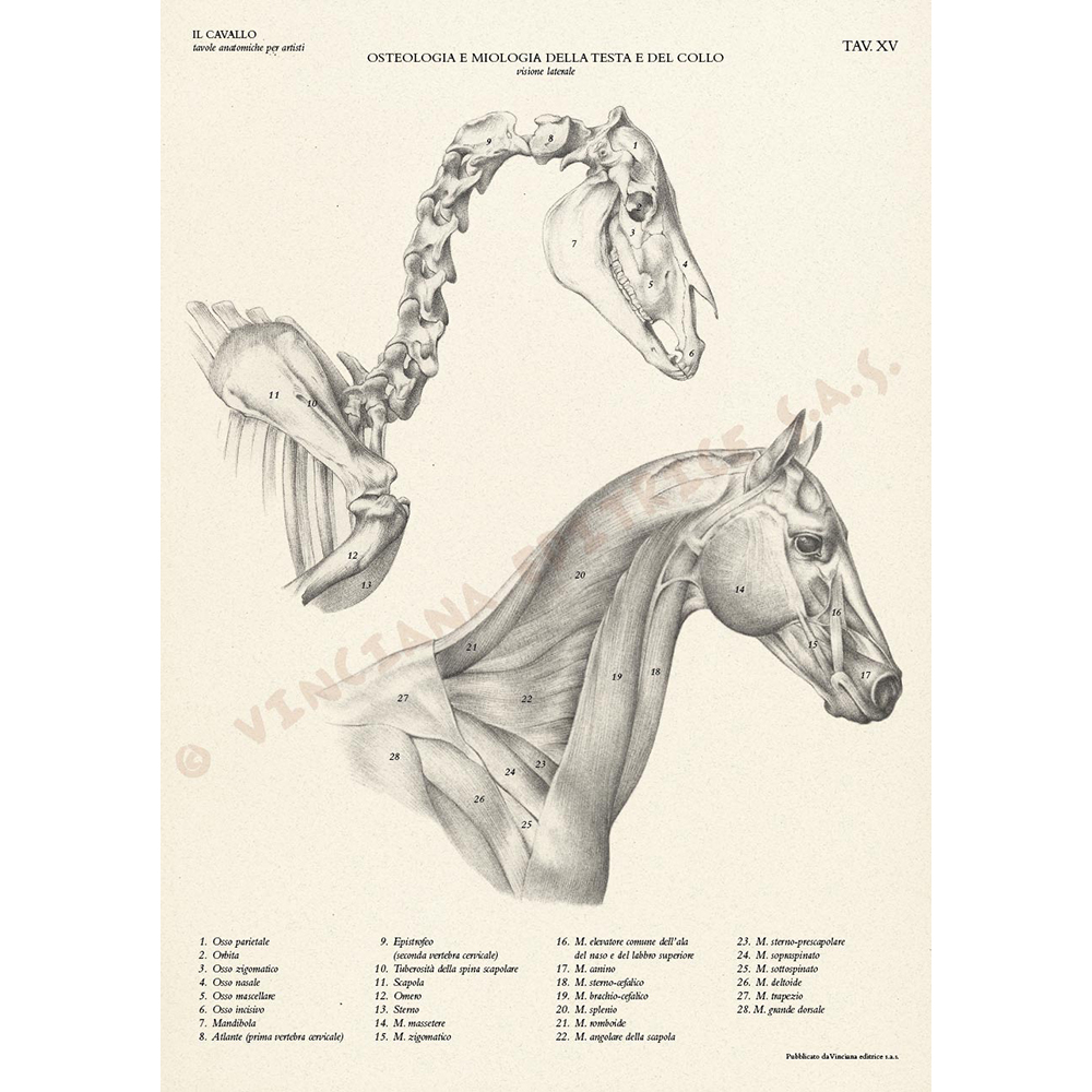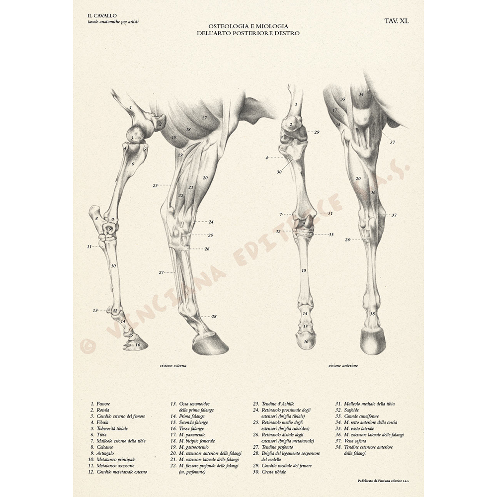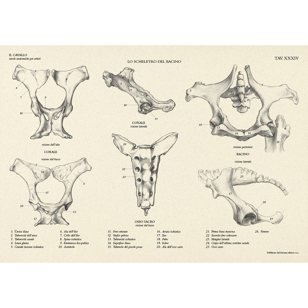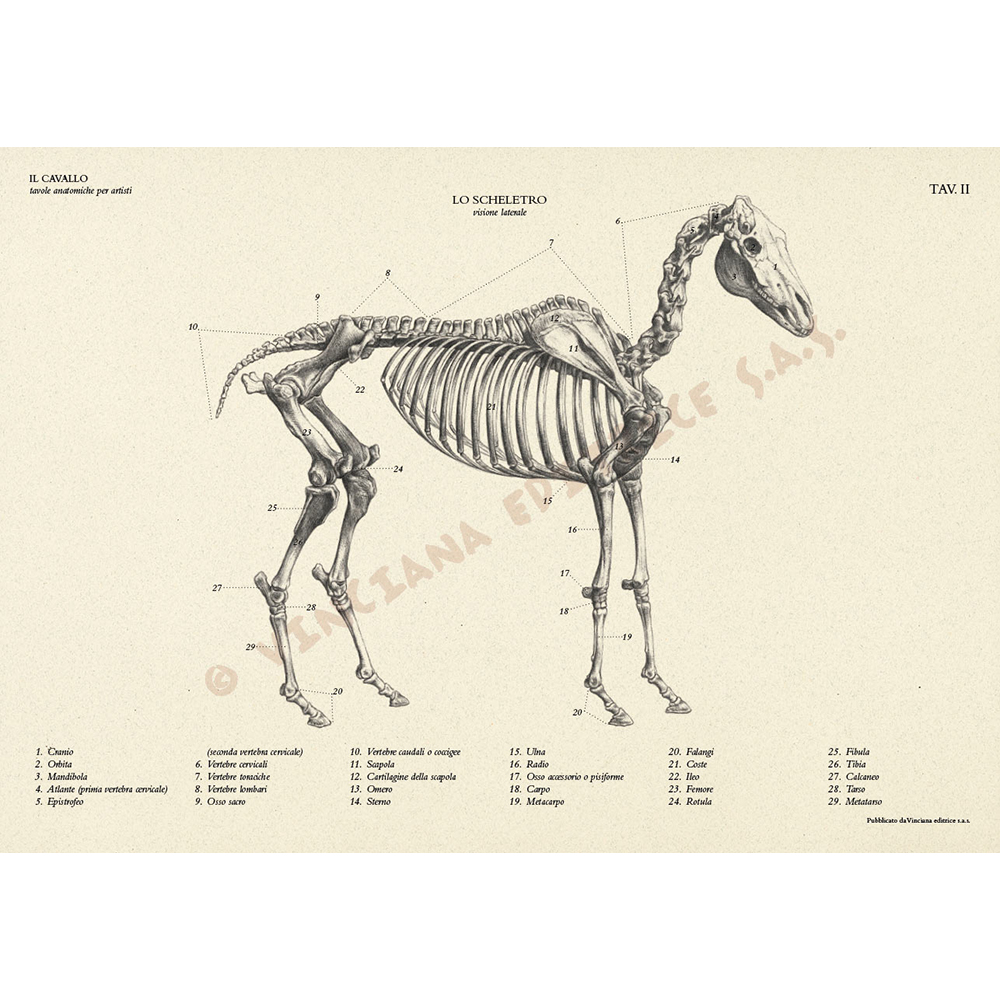 Mettendo a frutto l’esperienza maturata in quasi 40 anni di attività nel campo del disegno e della pittura attraverso la pubblicazione della Collana Leonardo, abbiamo deciso di editare questi due volumi dedicati all’anatomia del cavallo e del corpo umano a indirizzo artistico. Questo prodotto editoriale si impone in primo luogo per la particolare veste grafica, ispirata alla struttura dei testi anatomici di fine Ottocento: il volume infatti è costituito da 48 tavole sciolte più un testo didascalico. La struttura del libro permette all’utente di servirsi delle singole tavole senza gli impedimenti derivanti dalla legatura: sarà possibile, ad esempio, confrontare osteologia e miologia affiancando le tavole relative a una determinata parte, che essa sia la testa o il torace. Ogni singola tavola presenta la numerazione, l’indicazione della parte illustrata e la sua nomenclatura anatomica; in tal modo l’utilizzo delle tavole è indipendente dal testo e la scelta della lettura è lasciata a chi vuole approfondire le proprie conoscenze in campo anatomico.