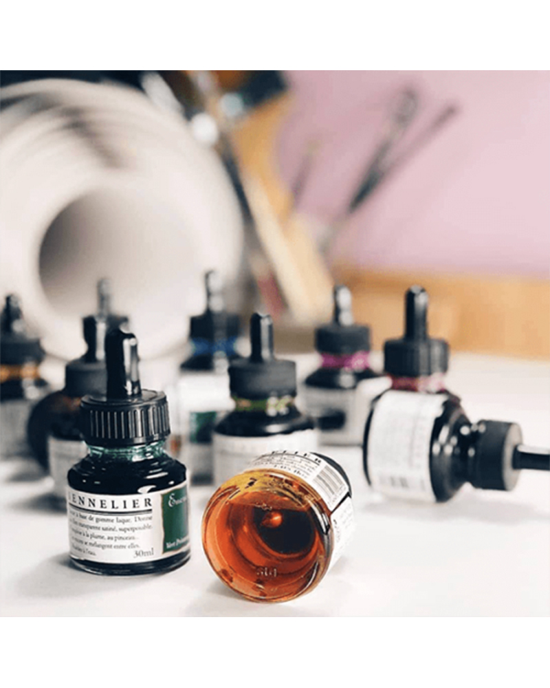 L’inchiostro a base di gommalacca SENNELIER, molto simile all’inchiostro cinese, è disponibile in numerose tonalità di alta qualità , in flaconi da 30 ml.
