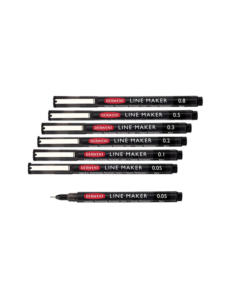 La penne ad inchiostro nero Line Maker di Derwent è un fineliner con inchiostro a base d’acqua pigmentato e resistente alla luce.