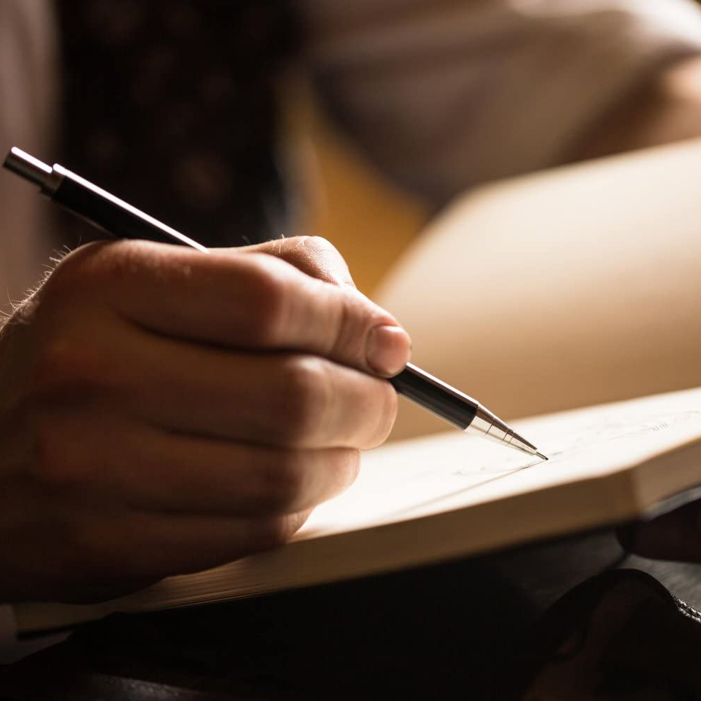 Dispone di pennino tascabile retrattile, gomma per bottoni nascosta e clip da taschino in metallo. Disponibile con canne da 0,5 mm e 0,7 mm e conduttori in grafite HB e 2B.