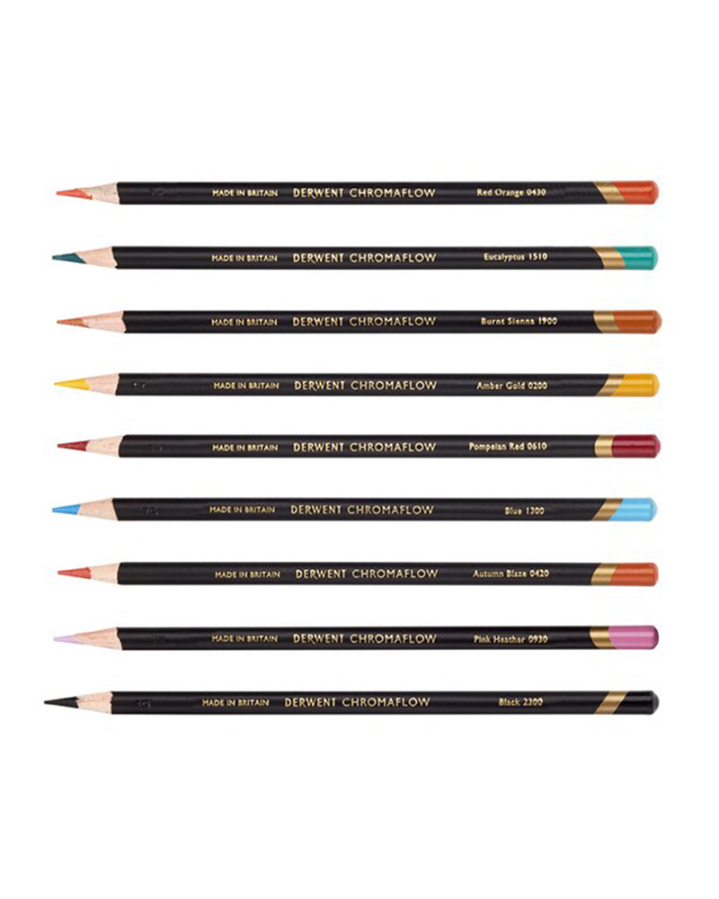 Le matite colorate CHROMAFLOWdi Derwent sono matite a base di cera di qualità professionale per artisti, formulate con pigmenti ricchi per offrire colori vivaci, sfumabili con una stesura uniforme e che risaltano anche su carta scura.