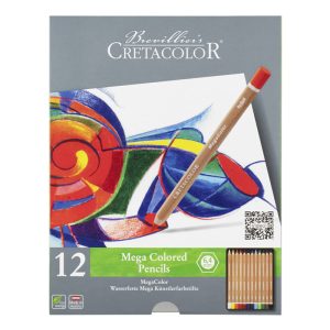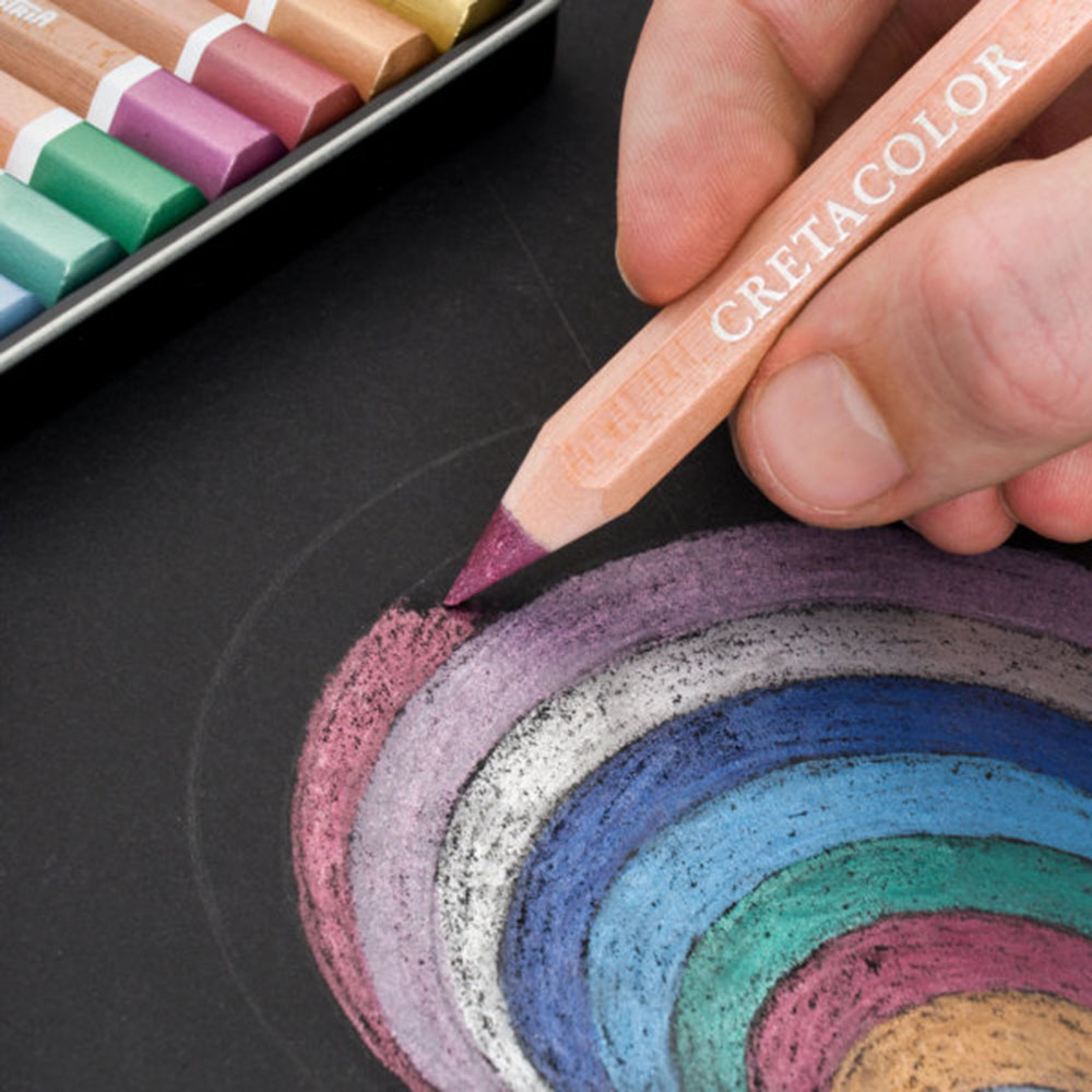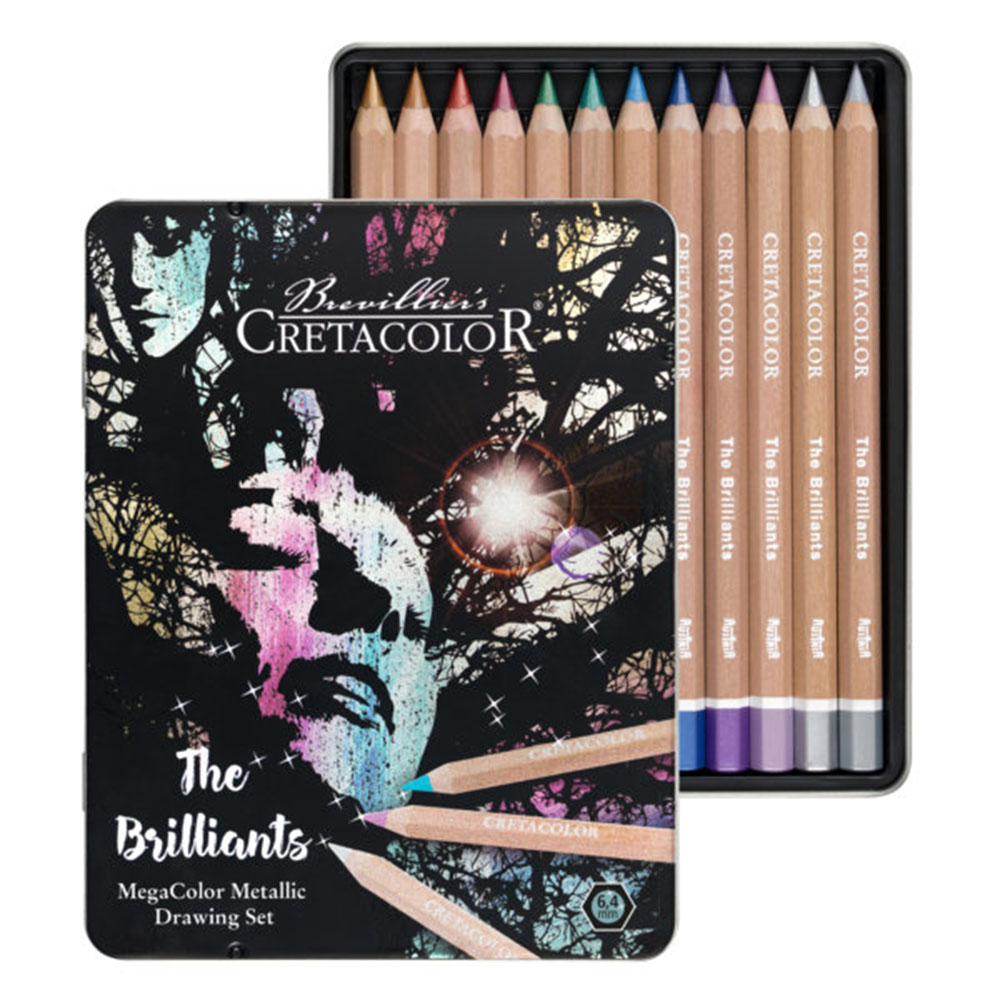 Il set da disegno a matita colorata metallica Mega Color di Cretacolor, The Brilliants, presenta 12 colori metallici altamente pigmentati per accenti scintillanti e colori opachi, specialmente su superfici scure.