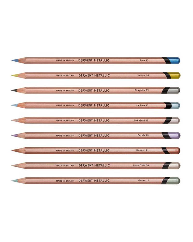 Le matite Derwent Metallic sono matite scintillanti e altamente metalliche che si fondono magnificamente insieme per creare effetti metallici vividi e sorprendenti, in particolare su carta scura. Con una nuova formulazione metallica intensa che esalta l’aspetto del colore, i pigmenti luccicanti e il nucleo forte producono una definizione brillante e una ricca applicazione del colore. Adatto per una vasta gamma di progetti artistici e artigianali. Disponibile in un’ampia gamma di 20 colori metallizzati, inclusi otto nuovi colori.