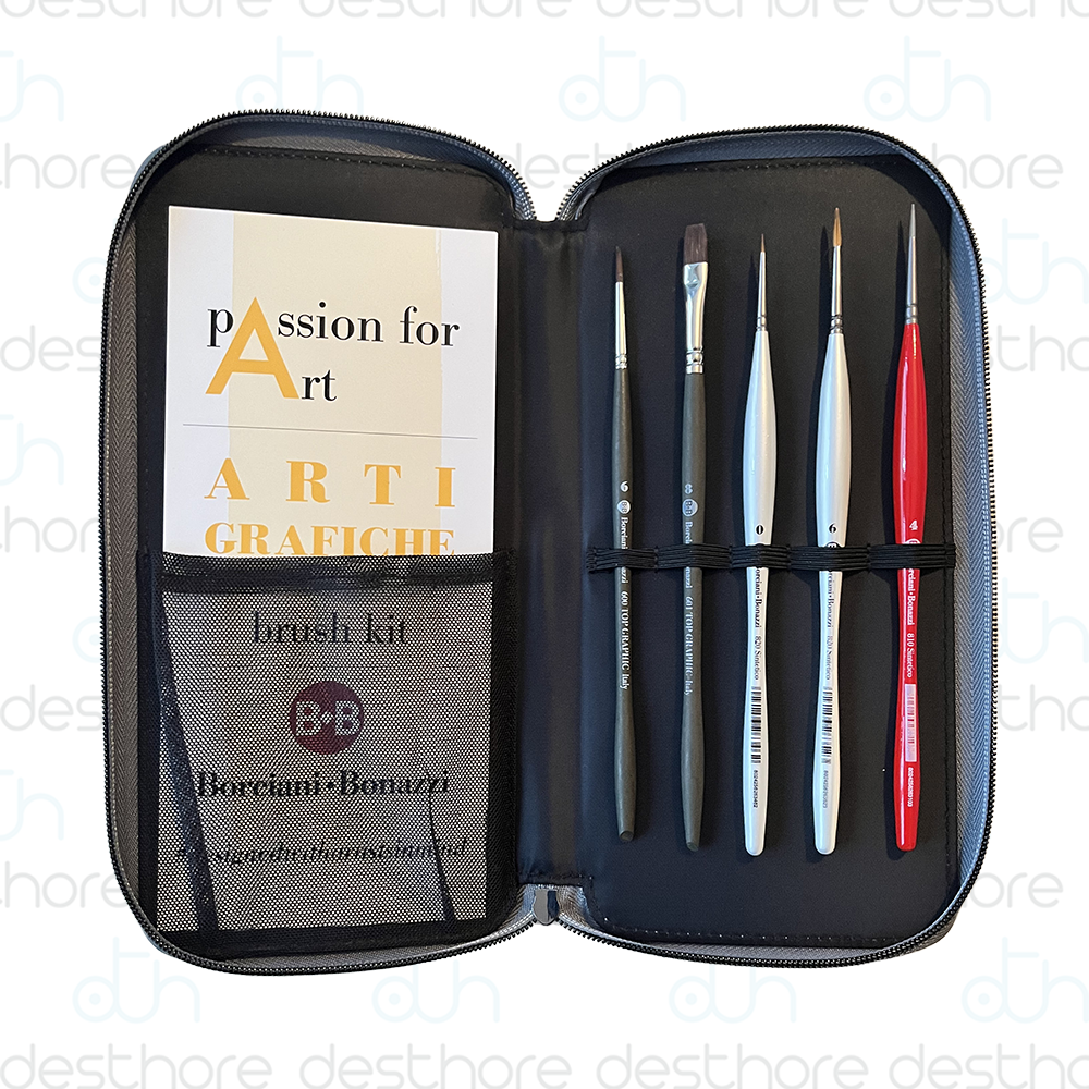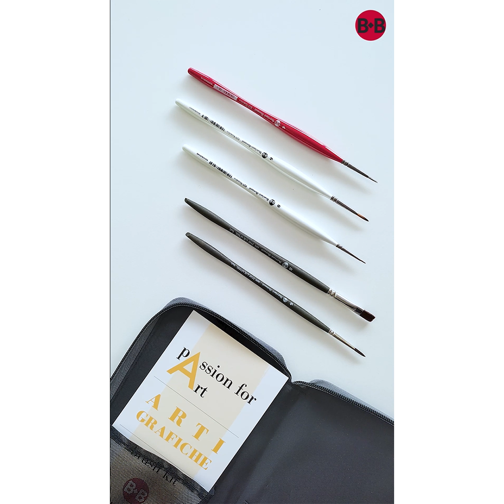 Il nuovo set Passion for Art Arti Grafiche Edition è un nuovo kit predefinito che contiene una selezione di 5 pennelli in filati sintetici che hanno in comune la definizione del tratto pur utilizzando diversi medium: calligrafia, inchiostratura, grafismi dalle linee sottili e precise, illustrazione e disegno pittorico. Il risultato è un tratto che si avvicina notevolmente all’utilizzo di strumenti come matite e pennini.