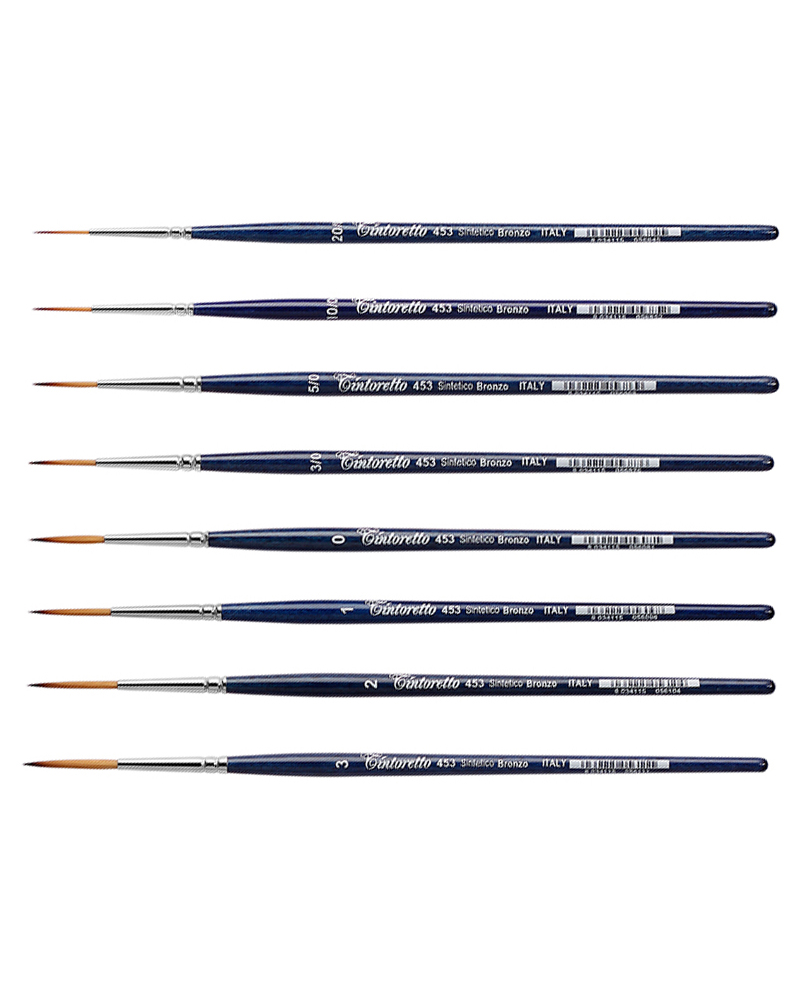 Pennello tondo extra lungo, sintetico Bronzo. Ghiera in ottone nichelato. Manico corto di legno verniciato blu.