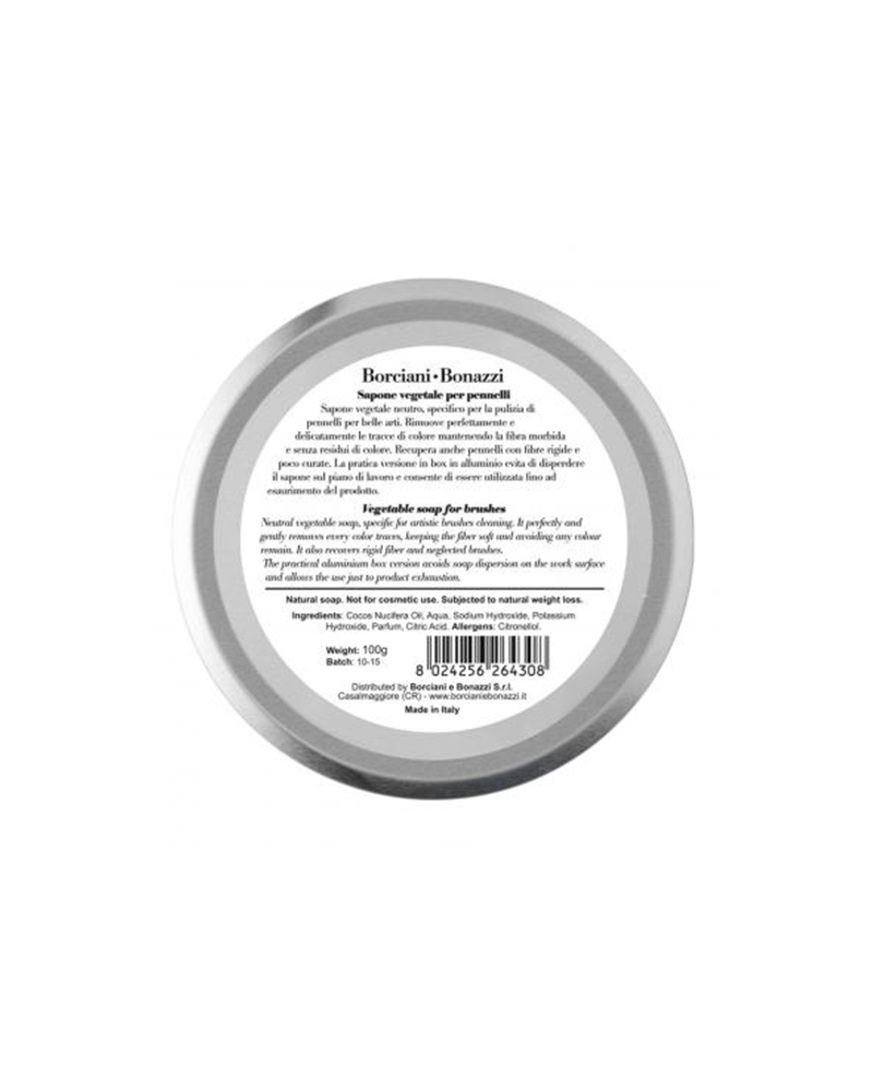 Il sapone vegetale neutro Borciani & Bonazzi in box di alluminio da 100 gr specifico per la pulizia dei pennelli per belle arti, caratterizzato da una speciale formula emolliente e idratante.