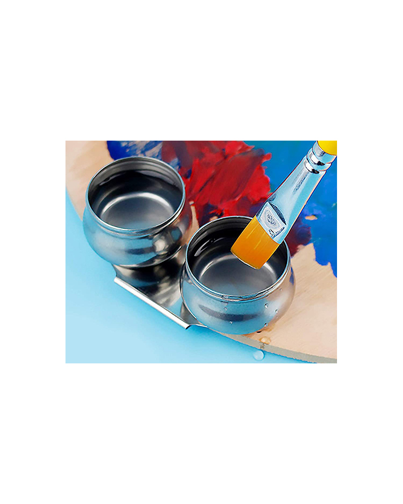 Accessorio pratico e molto utilizzato dai pittori, questo scodellino si applica alla tavolozza – grazie al gancio a molla che lo rende ben saldo durante la lavorazione – per avere i propri diluenti a portata di pennello durante l’esecuzione dell’opera.