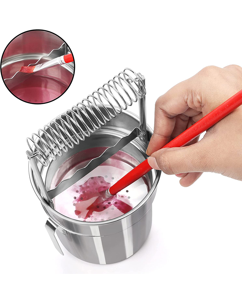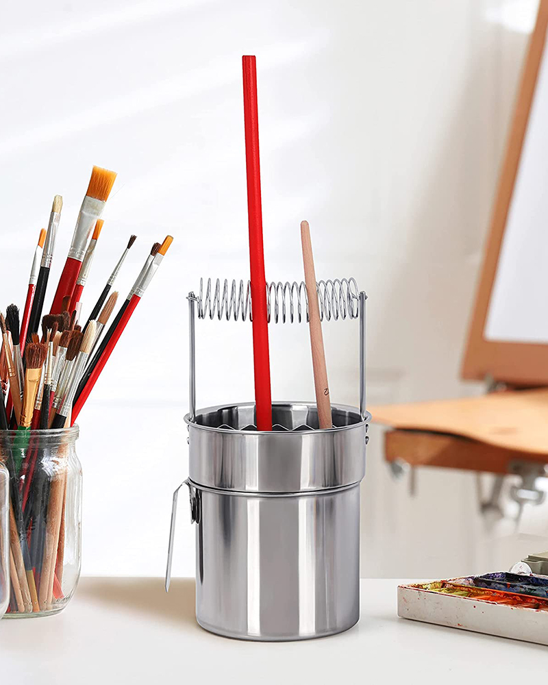 Tra gli articoli più pratici per chi dipinge, il lavapennelli è fondamentale per la pulizia e la durata nel tempo dei pennelli. La molla consente di tenere i pennelli – sia a manico lungo che corto – sospesi nel solvente pulito (grazie al filtro metallico removibile) senza che la punta si deformi poggiando sul fondo del contenitore.