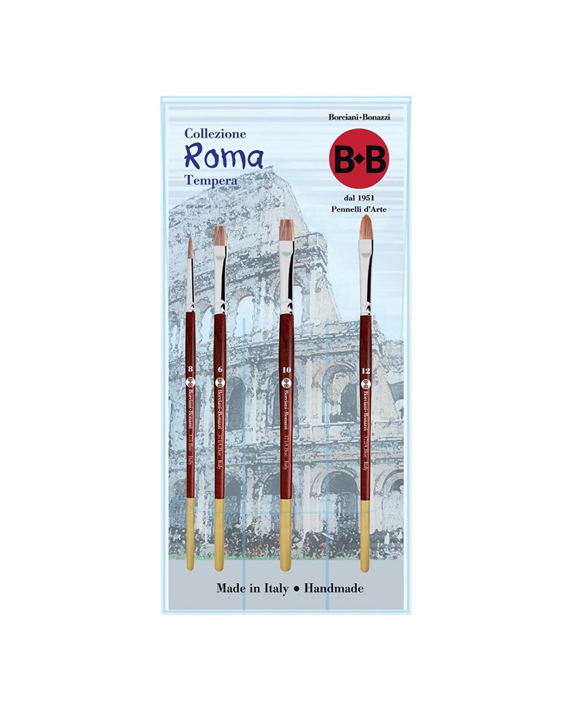 Il set Collezione Roma è composto da 4 pennelli in pelo naturale di bue extra con ghiera in ottone nichelato e manico corto, delle seguenti misure: – Serie 375 Mis. 8 – Serie 371/C Mis. 6 e 10 – Serie 372/C Mis. 12