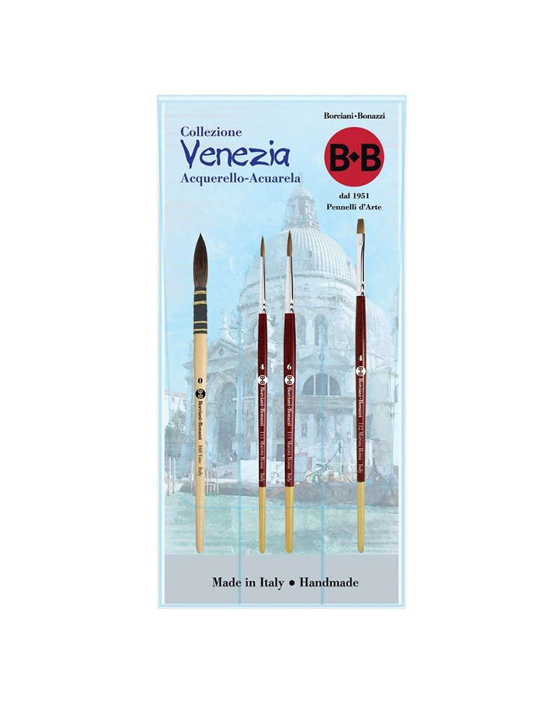 Il set Collezione Venezia è composto da 4 pennelli in filato naturale con ghiera in ottone nichelato e manico corto, delle seguenti misure: un bombasino Serie 168 mis. 0, due pennelli tondi manico corto Serie 111 in martora rossa misure 4 e 6, un pennello piatto Serie 112 in martora rossa numero 4.