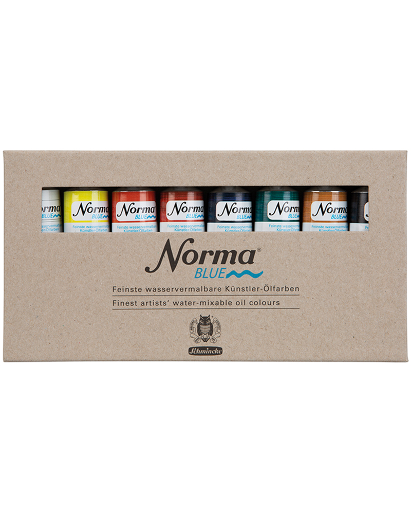 Il set NORMA Blue contiene 8 tonalità di colori sopraffini ad olio per Artisti, in tubetti da 35 ml, che rappresentano un assortimento base ideale mescolabili con molte altre tonalità brillanti.