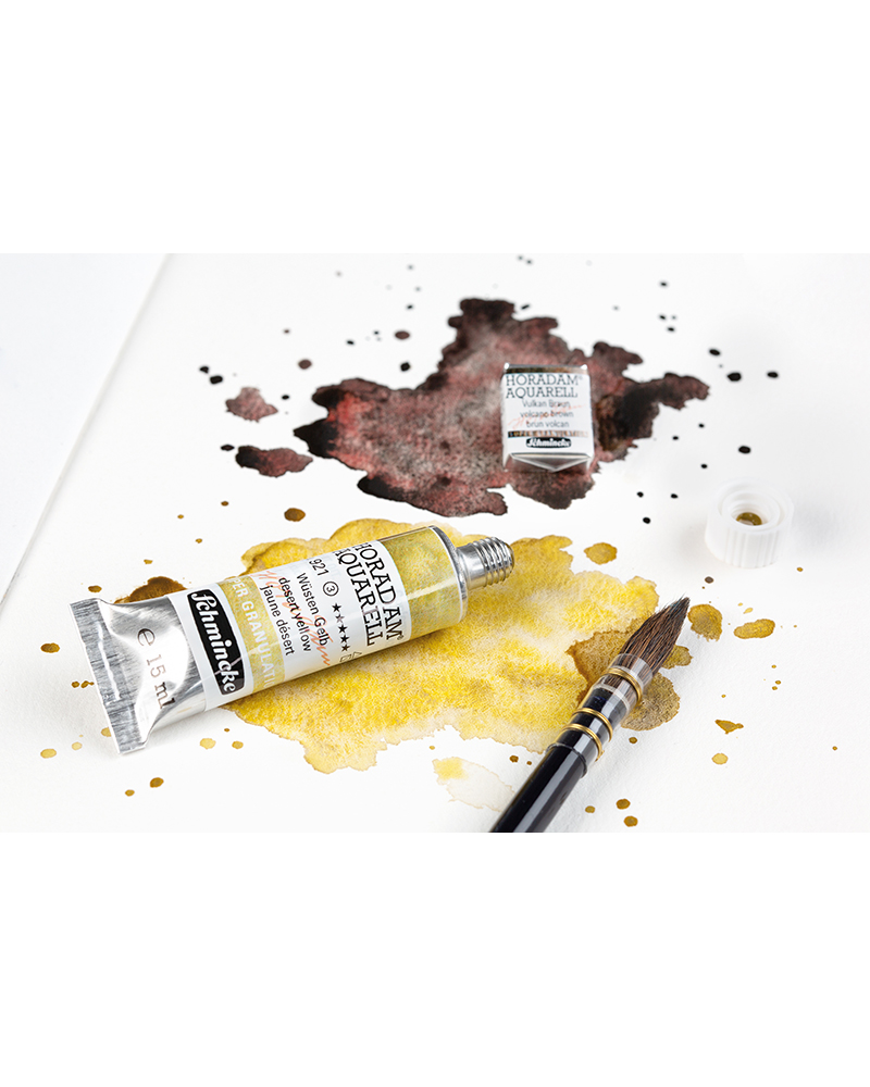 La nuova edizione speciale HORADAM AQUARELL “Colori Super Granulati” un totale di 40 tonalità in tubi da 15 ml, divisi in 5 tonalità ciascuno nella serie “Mare profondo”, “Ghiacciaio”, “Galassia”, “Bosco”, “Tundra”, “Palude”, “Deserto”, “Vulcano” e l’ultima novità: il set “Urban”. Con questi insoliti colori ad acquerello, Schmincke espande le possibilità della pittura ad acquerello granulosa per includere sfumature insolite con un aspetto super granuloso. La combinazione di almeno 2 pigmenti granulati HORANAM intensifica l’effetto di granulazione, in cui i pigmenti sulla carta si uniscono in alcuni punti, per formare una “super granulazione”.