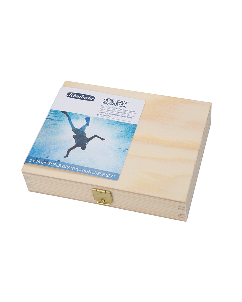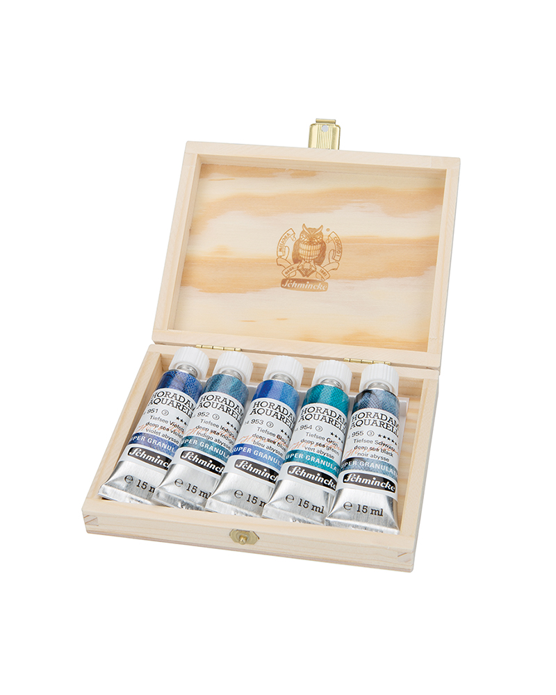 SET DI ACQUERELLI HORADAM SUPER GRANULATI 5 x 15 ML – ” MARE PROFONDO” – SCATOLA IN LEGNO –