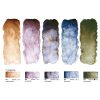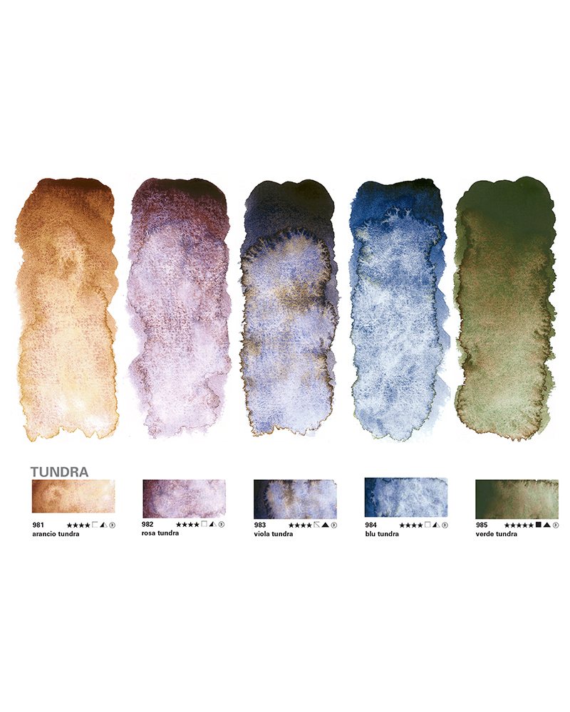 Le nuove tonalità sono formulate con i pigmenti di diverse gamme di colore, in modo che ulteriori cambiamenti di colore risultino dall’effetto di granulazione. Per esempio, la tonalità “Mare Profondo Indigo” è una combinazione di pigmenti viola e verdi, mentre “Ghiacciaio Marrone” contiene un pigmento marrone e uno verde. La formazione di questa nuova struttura naturale dei colori varia a seconda del fondo e della quantità d’acqua utilizzata. Più la carta è ruvida, più forte è l’effetto di granulazione.