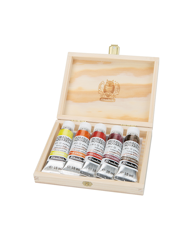 SET DI ACQUERELLI HORADAM SUPER GRANULATI 5 x 15 ML – ” VULCANO” – SCATOLA IN LEGNO –