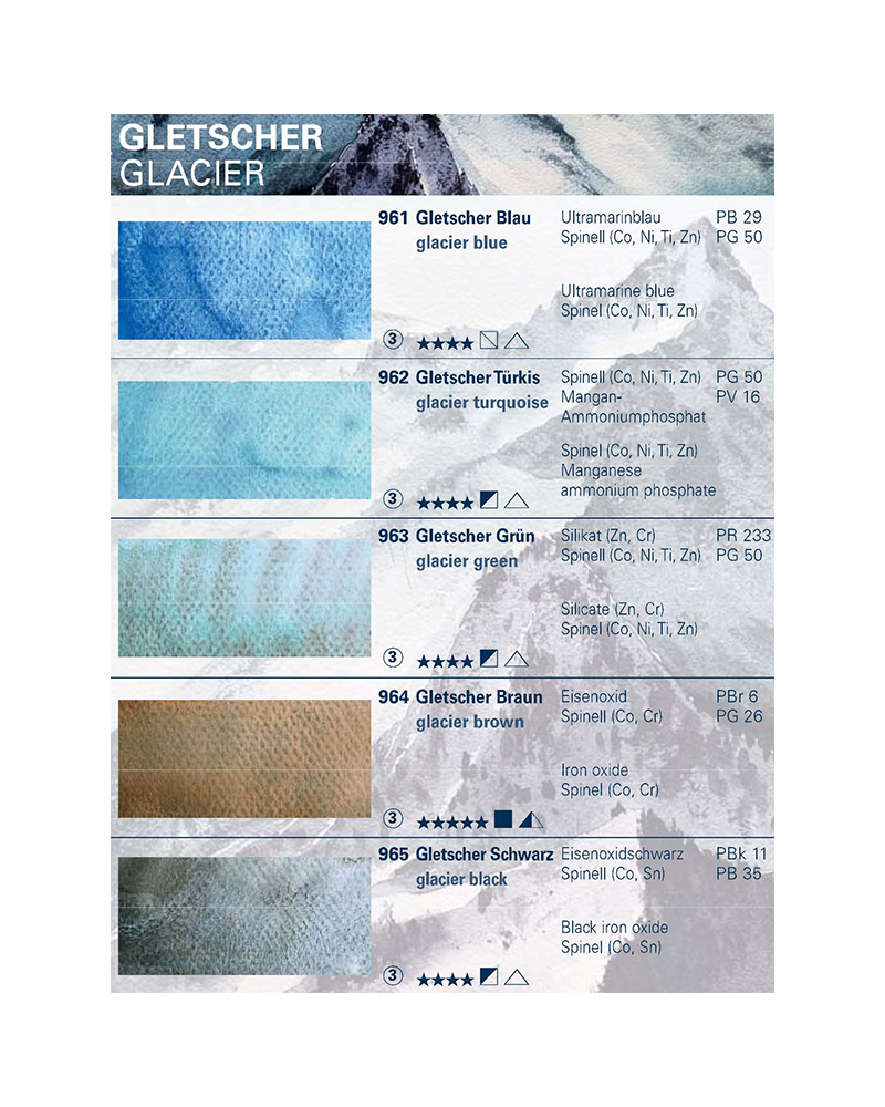 Le nuove tonalità sono formulate con i pigmenti di diverse gamme di colore, in modo che ulteriori cambiamenti di colore risultino dall’effetto di granulazione. Per esempio, la tonalità “Mare Profondo Indigo” è una combinazione di pigmenti viola e verdi, mentre “Ghiacciaio Marrone” contiene un pigmento marrone e uno verde. La formazione di questa nuova struttura naturale dei colori varia a seconda del fondo e della quantità d’acqua utilizzata. Più la carta è ruvida, più forte è l’effetto di granulazione.