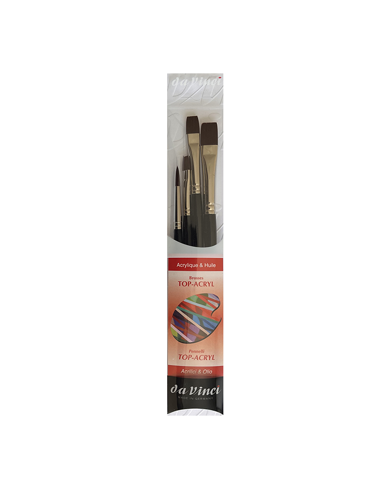 Il set di pennelli TOP per acrilico da Vinci della serie 4220 sono in fibra sintetica, molto elastici, estremamente strapazzabili e mantengono una buona forma. I pennelli sono ben adatti per la pittura acrilica e su stoffa.