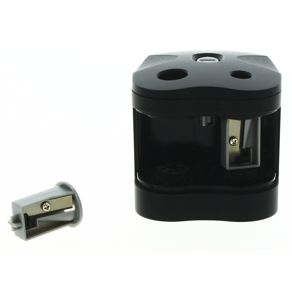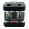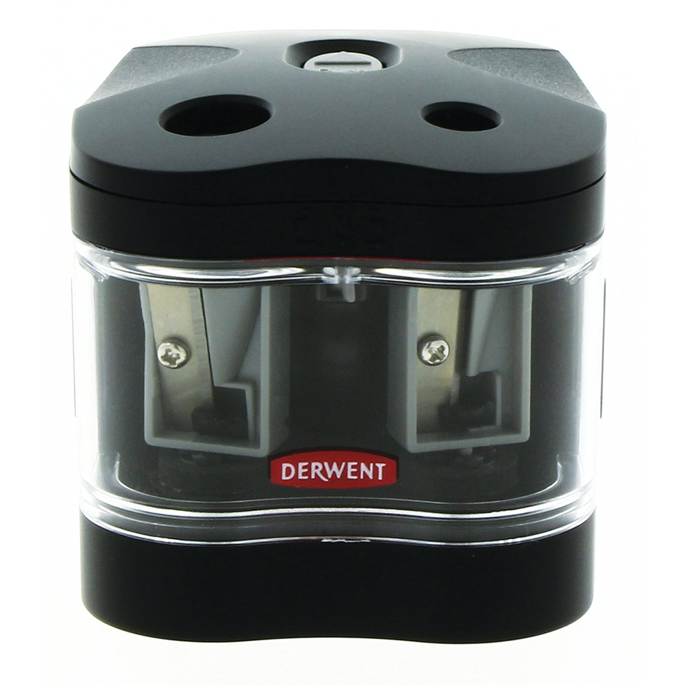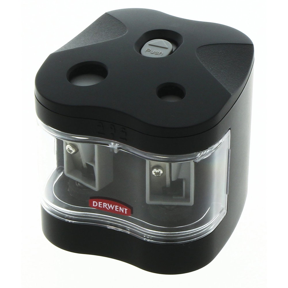 Temperamatite a batteria produzione Derwent, con doppio Foro e Contenitore per trucioli, facilmente rimovibile. Lame durevoli e di alta qualità , in grado di appuntire matite e pastelli di formati diversi: Jumbo (9 – 12 mm) e matite regolari (6 – 8 mm).
